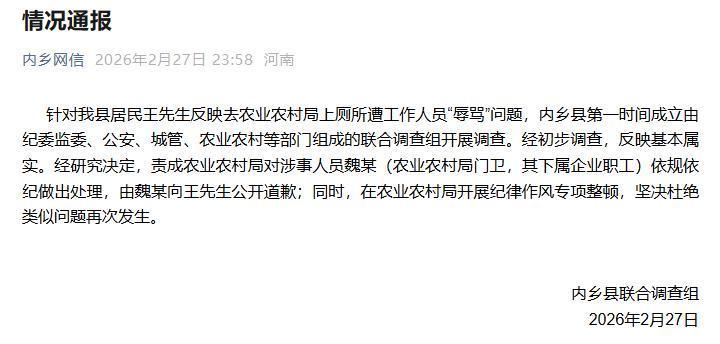 2月27日晚,“内乡网信”微信公众号发布情况通报,以下为通报详情——针对我县居民王先生反映去农业农村局上厕所遭工作人员“辱骂”问题,内乡县第一时间成立由纪委监委、公安、城管、农业农村等部门组成的联合调查组开展调查。经初步调查,反映基本属实。经研究决定,责成农业农村局对涉事人员魏某(农业农村局门卫,其下属企业职工)依规依纪做出处理,由魏某向王先生公开道歉;同时,在农业农村局开展纪律作风专项整顿,坚决杜绝类似问题再次发生。内乡县联合调查组2026年2月27日