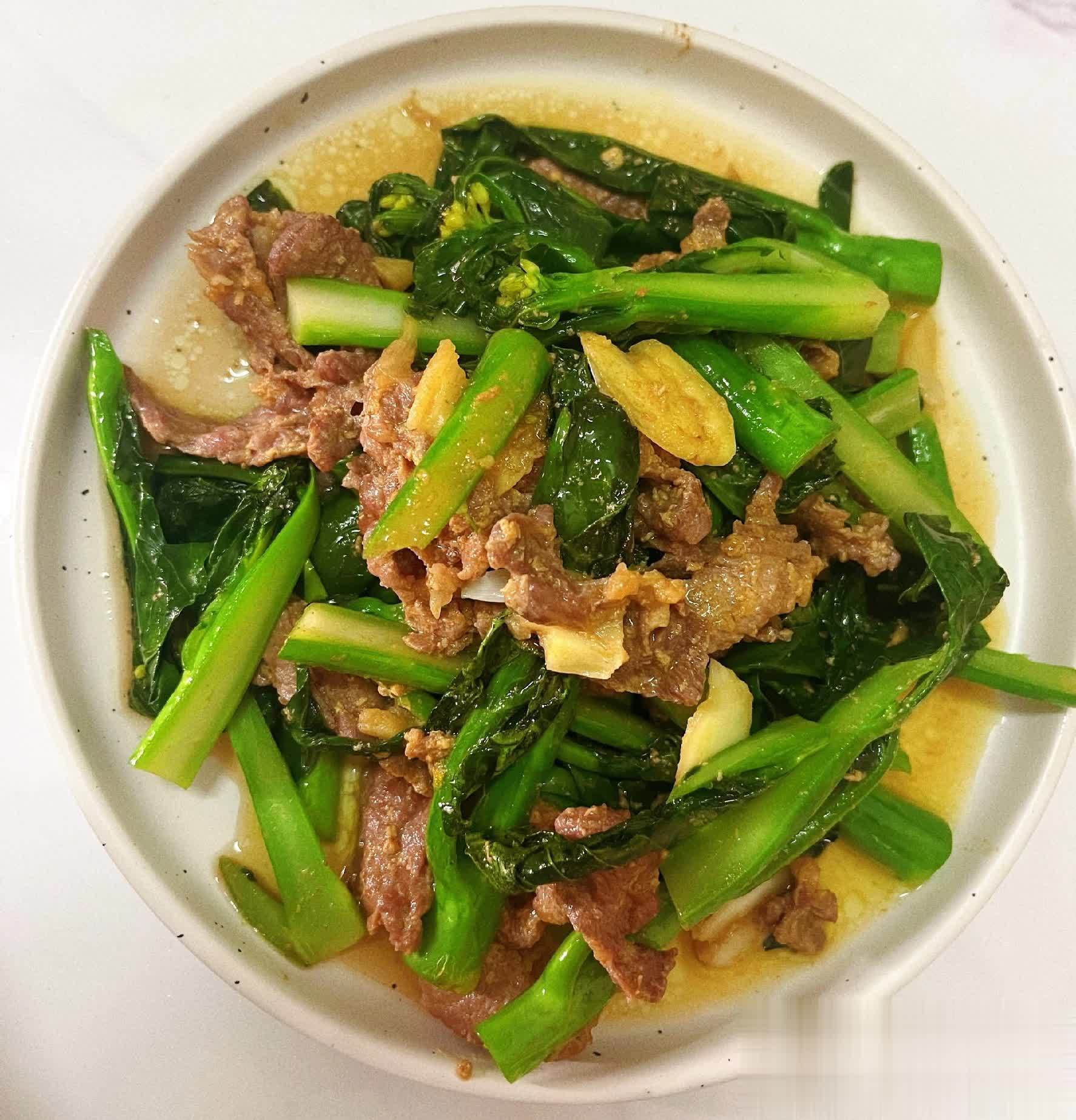 芥蓝炒牛肉准备材料:牛肉、芥蓝、姜丝、蒜瓣