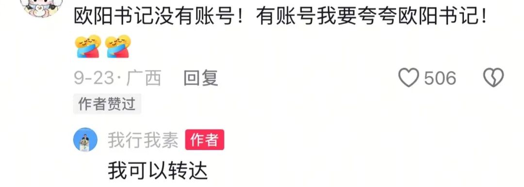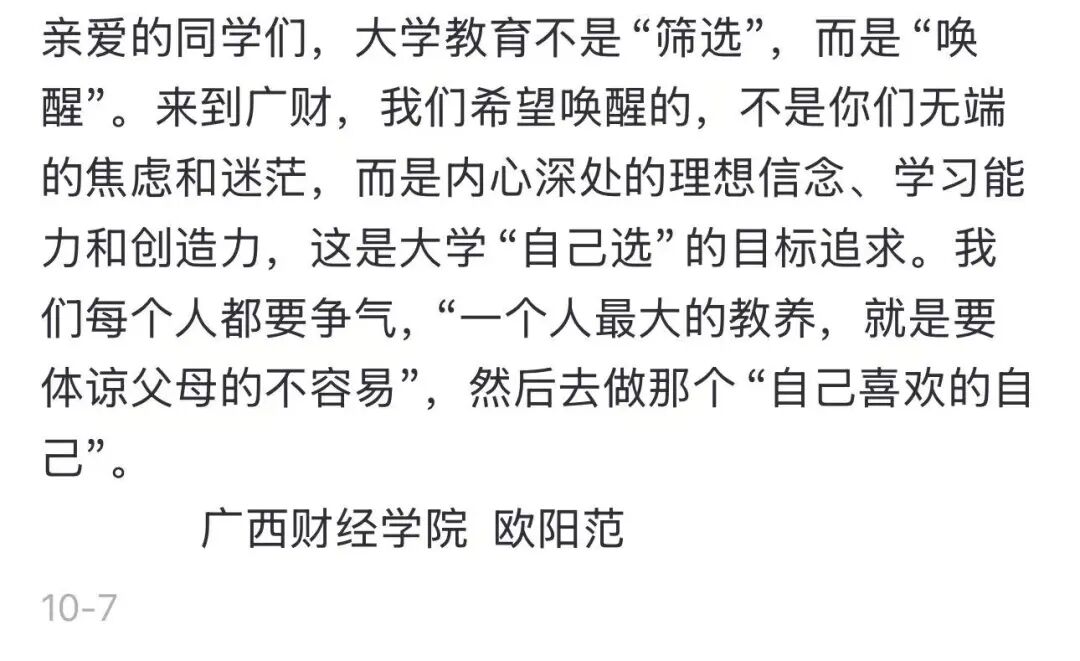 10月7日,范祚军校长抖音号发布的广西财经学院党委书记欧阳进的文章提到,学校通过“抖音”和“小红书”,校长前台接单,书记在幕后指挥和决策,学校不断倾听同学们的声音、回应同学们的期待。
