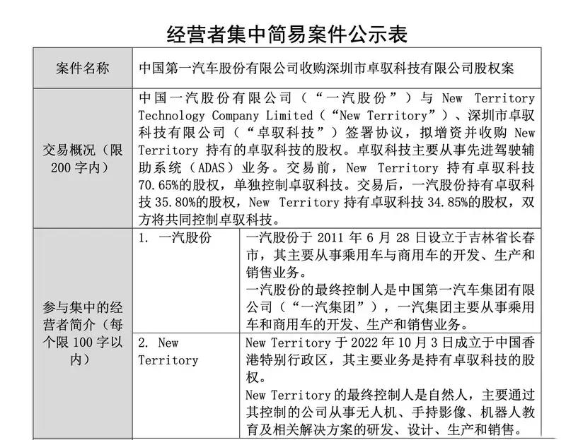 9月22日,国家市场监管总局公示了中国第一汽车股份有限公司收购深圳市卓驭科技有限公司股权案。根据公示内容,一汽股份与New Territory、卓驭科技签署协议,拟增资并收购New Territory持有的卓驭科技股权。