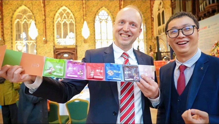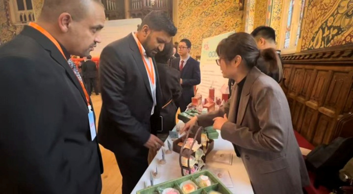 南京中医药大学带来的则是中医药文化和江苏非遗的碰撞。该校党委宣传部副部长刘丹青介绍,这次带来的金陵非遗药膳茶点灵感来自药食同源的中国饮食文化,印刷体验也是将中医药经典古籍和来自扬州的国家级非物质文化遗产雕版印刷技艺做了结合。“希望大家能在浓浓中国味道、书香气息中感受到中医药文化‘融入生命生活’的独特魅力。”曼彻斯特议员Naila Sharif 亲手制作了中医养生学专著《尊生要旨》中的“八段锦导引图”书叶,“太美了,这简直是Art(艺术)!”,她连连称赞并表示要带回家中珍藏。