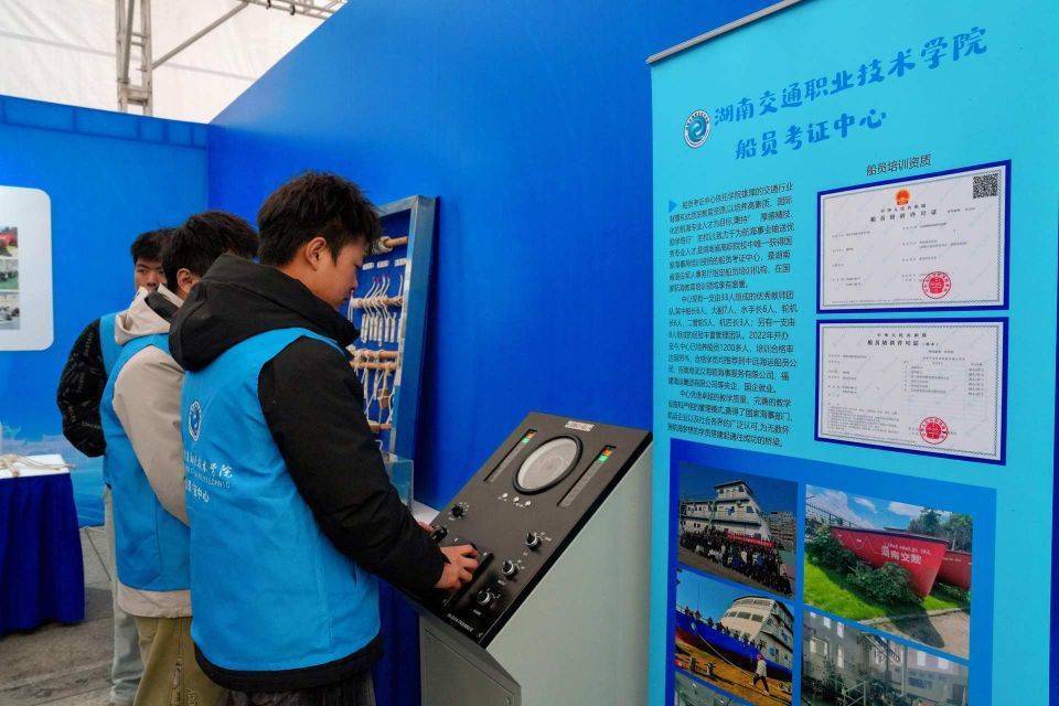 △陈章在展位现场演示如何操纵船上仪器。湖南人社供图